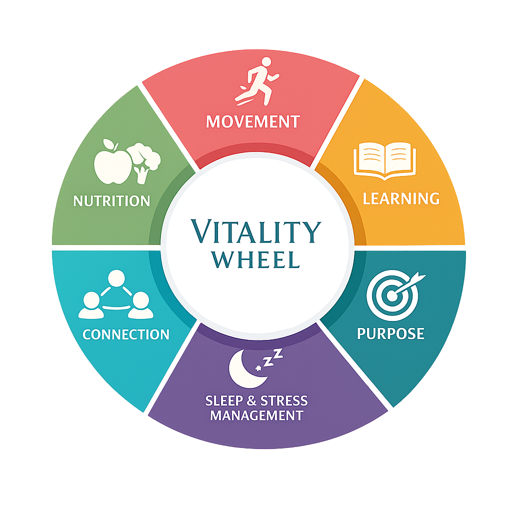 The Vitality Wheel shows how six core areas work together to support energy, resilience, and long-term health:
